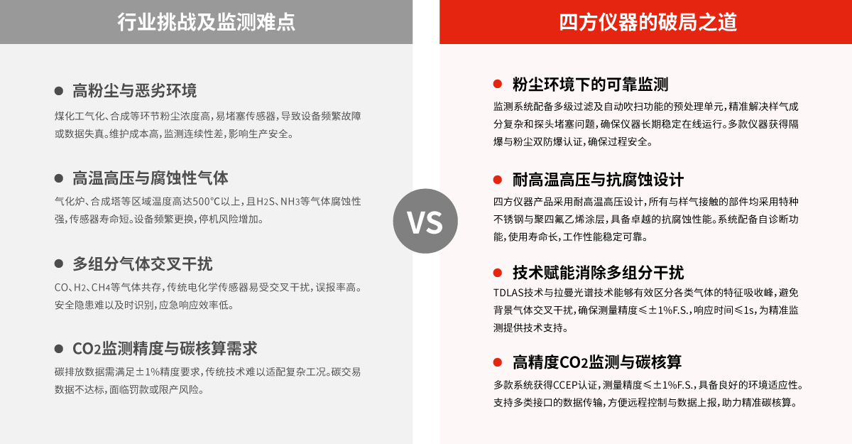 針對煤化工企業(yè)高粉塵、高腐蝕、多組分氣體監(jiān)測的復雜需求,四方儀器深度融合行業(yè)工藝特性與政策合規(guī)要求,提供從原料氣化到合成反應的全流程監(jiān)測解決方案,精準覆蓋多類重點氣體監(jiān)測需求,助力企業(yè)實現(xiàn)安全生產、節(jié)能降碳與長效發(fā)展。